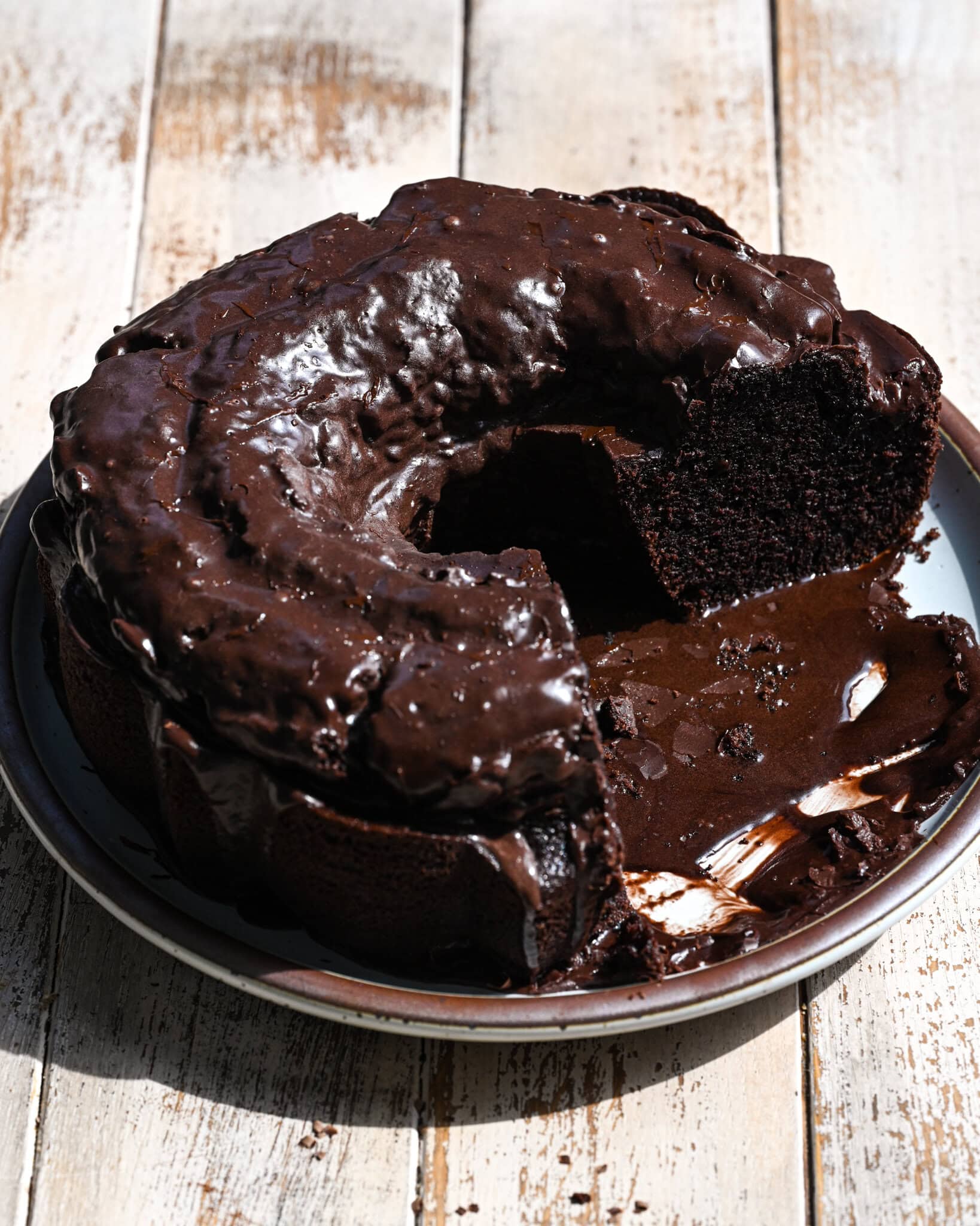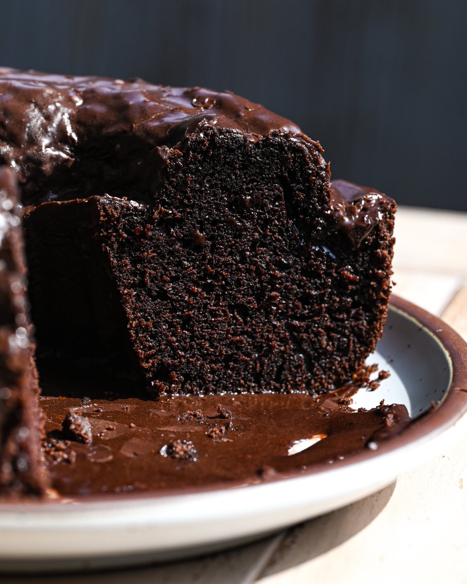I want you to picture the best slice of chocolate bundt cake: it’s not really airy and fluffy but dense and moist, as a bundt cake is. The chocolate flavor is prominent. If you’re lucky you got a slice where the topping gathered quite a bit and that topping is not just a simple glaze but one that gets everywhere, soaked into the top of the cake.