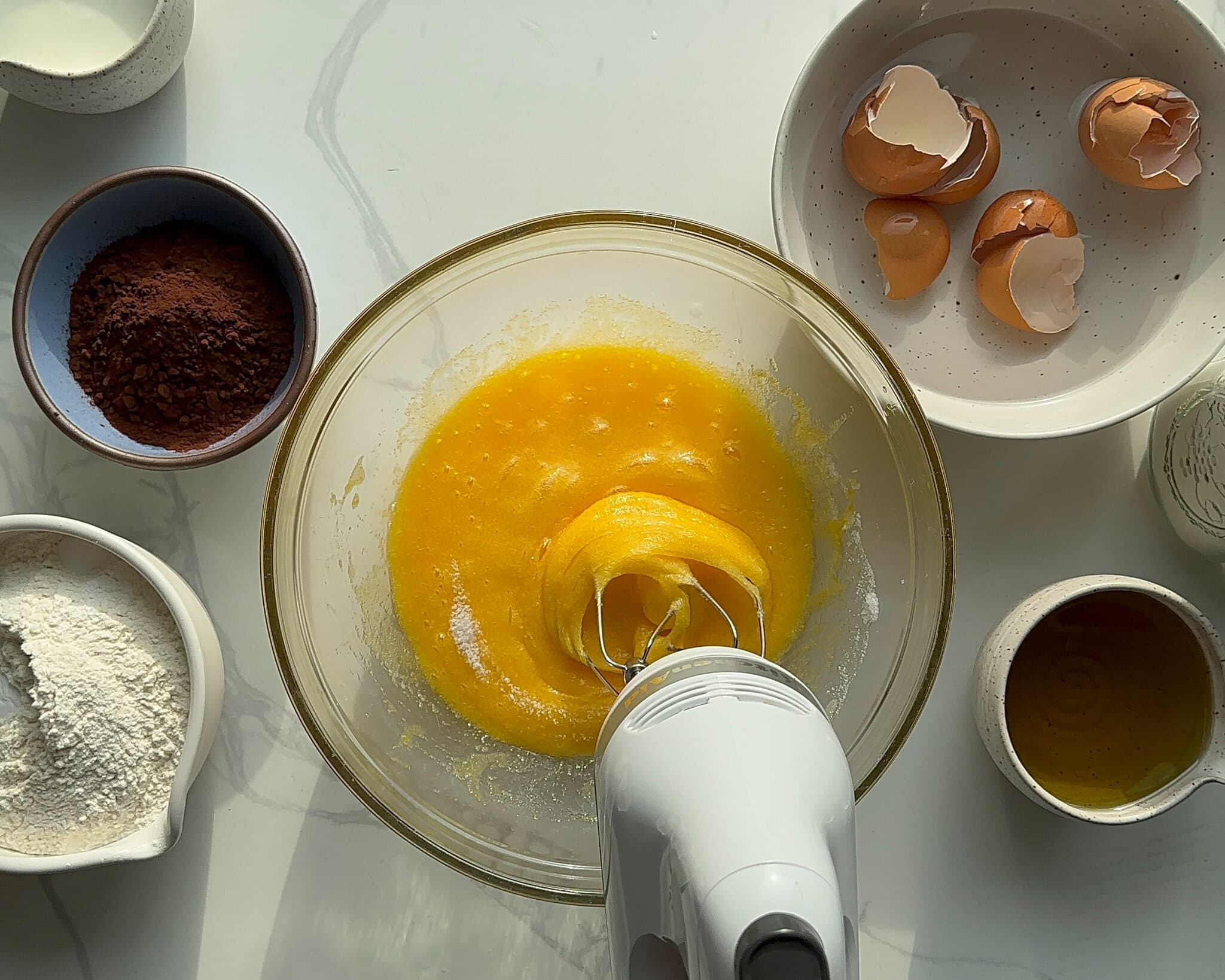 Slowly pour in the oil then beat to combine: