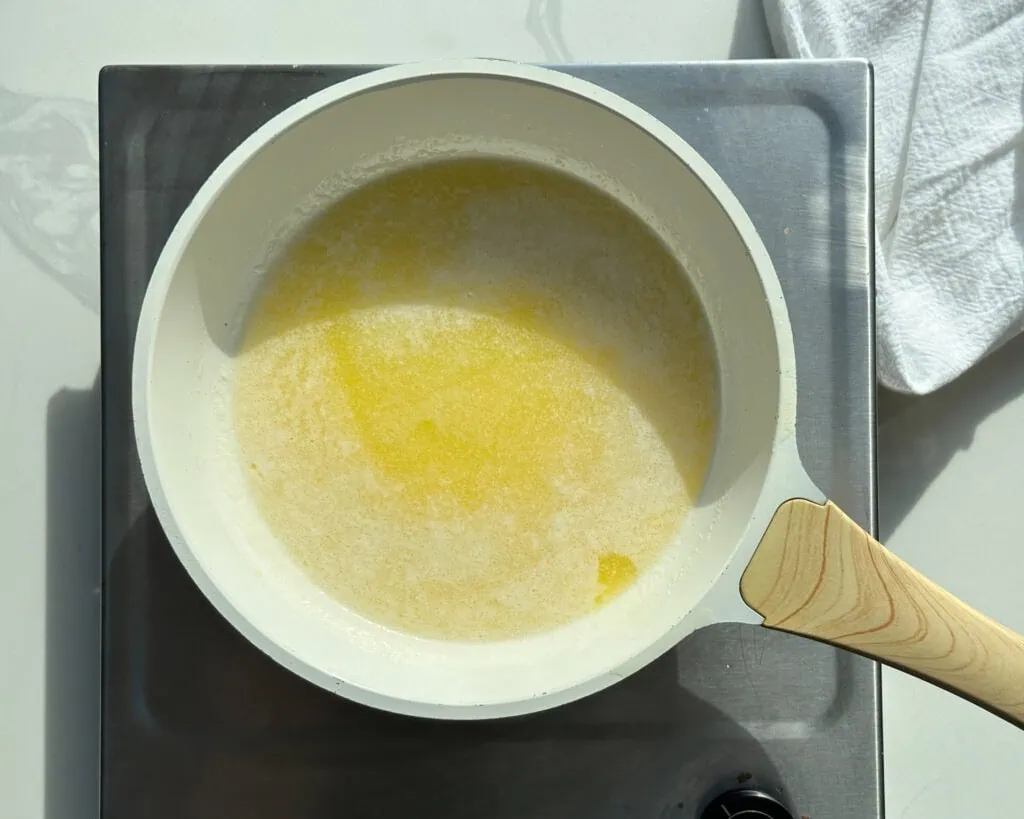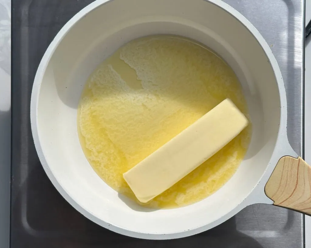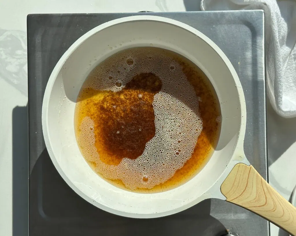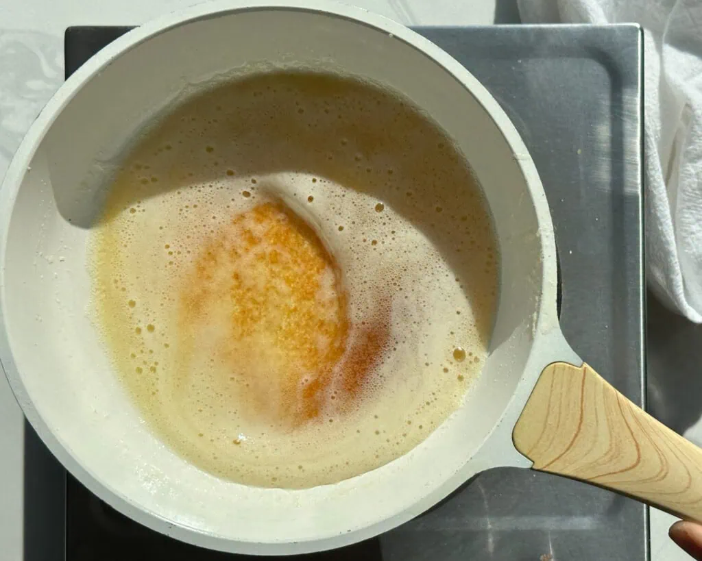 In a light colored skillet over medium-low heat, melt the butter, stirring the pan frequently. When it smells nutty and most of the bits turn a toasty brown, it’s done. Immediately remove from the heat so the milk solids do not burn.