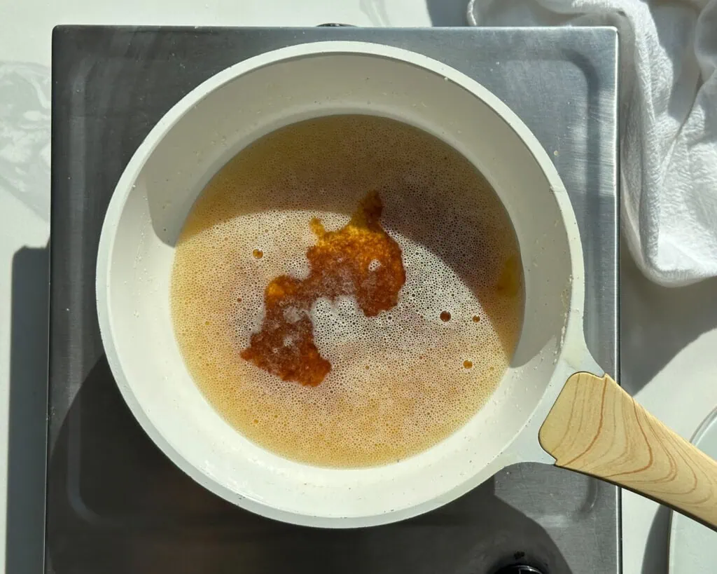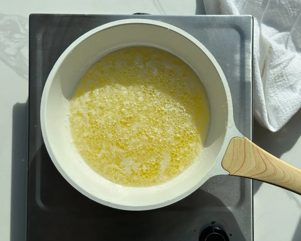 See: “foam”, a thick layer of tiny white bubbles that cover the yellow liquid below. If you swirl the butter or stir it, you’ll see little milk colored bits that look like panko, sinking to the bottom. You will likely also see some of those bits starting to change color.