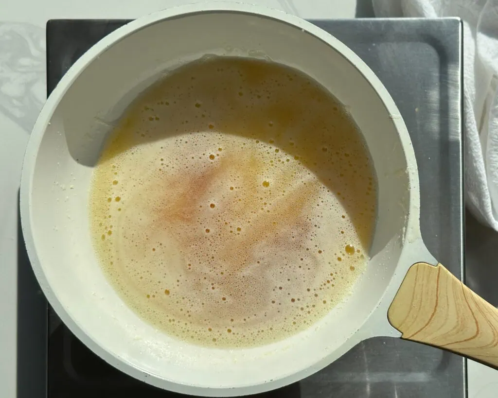 See: big bubbles emerging out of the yellow liquid and popping. They will sputter up and sometimes out of the pan. If it’s too aggressive, turn the heat down.
