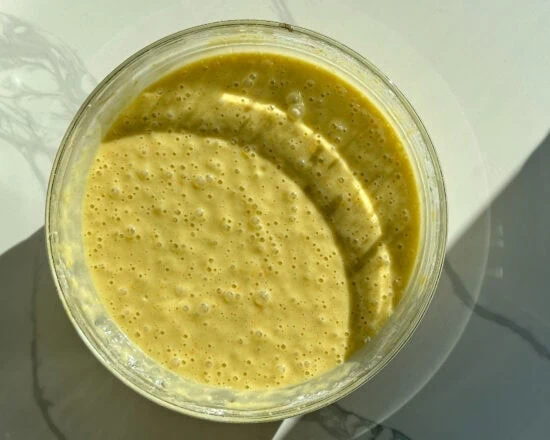 While beating, slowly pour in the oil (or oils – if you are using more than one kind). Once it’s all in, beat to combine.