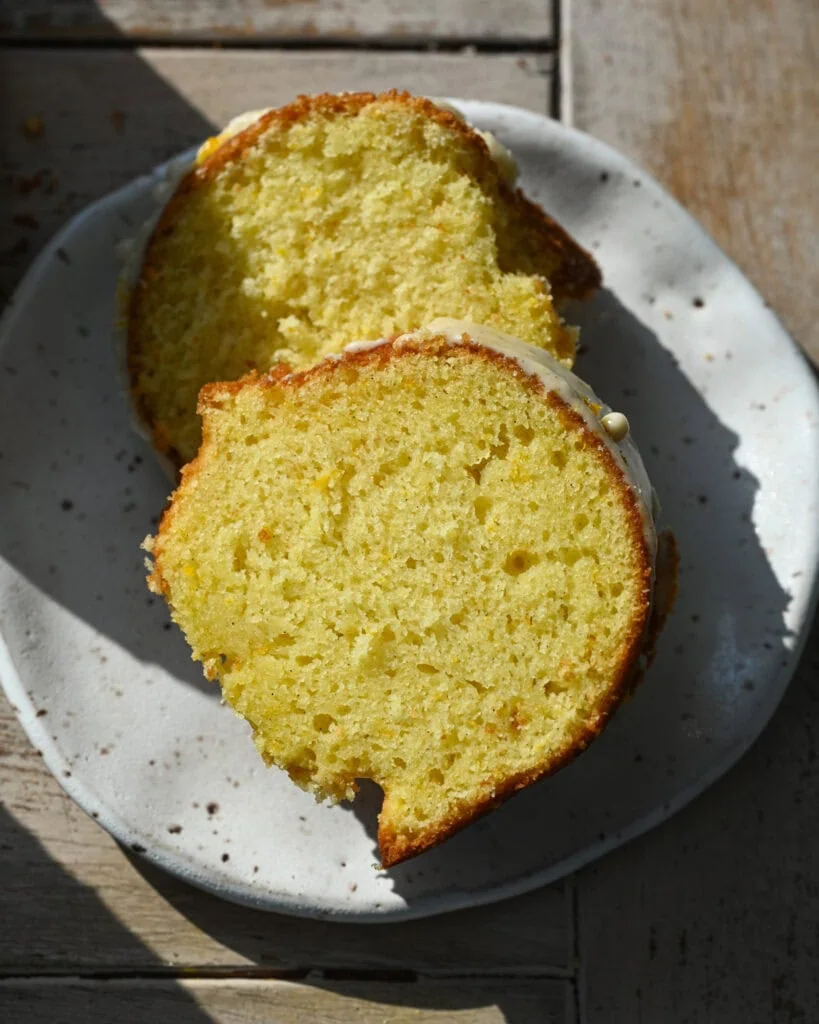 The first edition of this recipe is from early 2020, the cake was half the size and made in a smaller bundt pan. I had also used blood oranges which gave the glaze a beautiful pink tint. I cannot remember where I started with that one but when updating the recipe in feb 2026, I opted for cake flour instead of all purpose, swapped out additional egg yolks for whole eggs, and changed the leavening (my cake was sinking dramatically after baking). Other changes: using more orange juice so you get more of that lovely bright, fresh orange flavor.