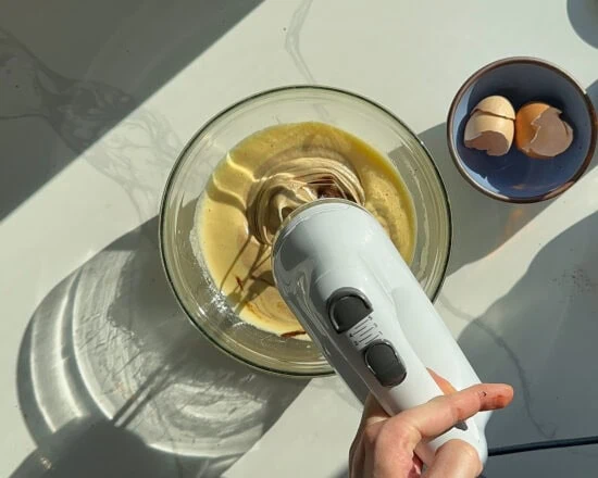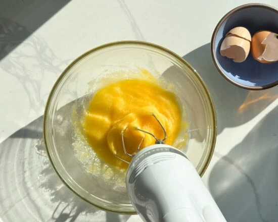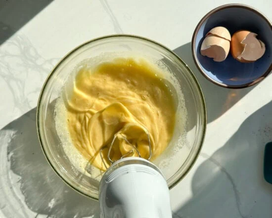 In a larger bowl add the sugar, salt and the eggs and use a hand mixer to beat them to the ribbon stage: the mix should become several times lighter and fluffy.
