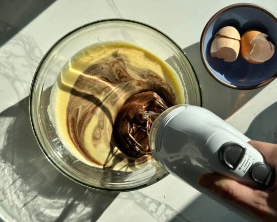 Start by gently melting the chocolate and butter together. The chocolate should be chopped up into smaller pieces so it doesn’t take too much heat to melt it.