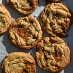 They will be misshapen out of the oven, this is due to the toffee melting and pushing out the cookie dough. As soon as they are out and while still very hot, use a round container to gently nudge them back into a circular shape (this is kind of like cookie scooting but very gently or the cookies will tear, a spoon works too). Sprinkle with flaky sea salt and let cool completely on the pan.