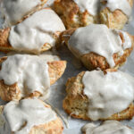 Preheat the oven to 400 F. If you will not be glazing the scones, you can brush the tops with cream/milk and sprinkle coarse sugar on top. Bake the scones until deeply golden all over and the centers no longer look wet; about 20-25 minutes. (p.s. Sometimes they rise and collapse onto their neighbors, that’s those lovely flaky layers!)